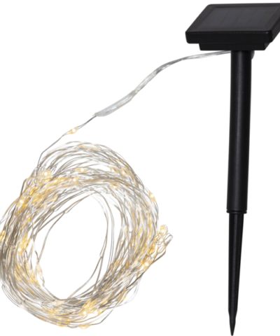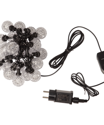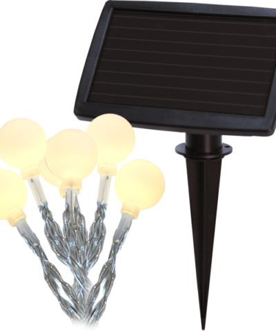 Solar-powered light chain with eight large plastic balls, each 8 cm, in each ball there is an engraved plastic disc that spreads out the warm white glow. Separate panel that makes it easy to have the light chain placed in the shadow, and the panel into the sun.
