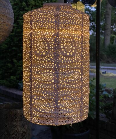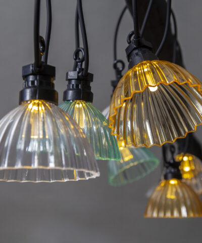 Solar-powered light chain with eight large plastic balls, each 8 cm, in each ball there is an engraved plastic disc that spreads out the warm white glow. Separate panel that makes it easy to have the light chain placed in the shadow, and the panel into the sun.