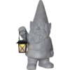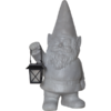 Kaunis iso puutarhatonttu sementinharmaana. Mukana oleva lyhty on ladattu aurinkokennolla ja hehkuu lämpimällä valkoisella valolla yön aikana.